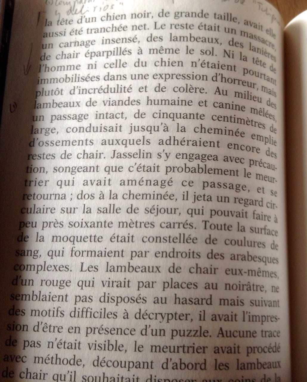 La cabeza de la víctima estaba intacta, limpiamente cortada y depositada sobre uno de los sillones delante de la chimenea, sobre el terciopelo verde oscuro se había formado un charquito de sangre; frente a la cabeza humana, en el sofá, había la de un perro negro de gran tamaño, también segada por un corte limpio. El resto era una matanza, una carnicería, había jirones, tiras de carne desperdigadas por el suelo. Sin embargo, ni la cabeza del hombre ni la del perro estaban inmovilizadas en una expresión de horror, sino más bien de incredulidad y de cólera. En medio de los jirones de carne humana y canina mezclada, un pasillo intacto, de cincuenta centímetros de ancho, llevaba hasta la chimenea llena de huesos con residuos de carne todavía adheridos. Jasselin se encaminó hacia allí con precaución, pensando que probablemente había sido el asesino el que había abierto aquel pasillo, y se volvió; de espaldas a la chimenea, recorrió con una mirada circular la sala, que podía tener aproximadamente unos sesenta metros cuadrados. Toda la superficie de la moqueta estaba constelada de flujos de sangre que formaban arabescos complejos en algunas partes. Los jirones mismos, de un rojo que en algunos sitios rayaba en negruzco, no parecían diseminados al azar, sino con arreglo a motivos difíciles de descifrar, tenía la impresión de hallarse delante de un rompecabezas. No había huellas visibles de pisadas, el asesino había procedido con método, recortando primero los pedazos de carne que quería colocar en los rincones de la habitación, y volviendo poco a poco hacia el centro, con cuidado de dejar libre un camino hacia la salida.